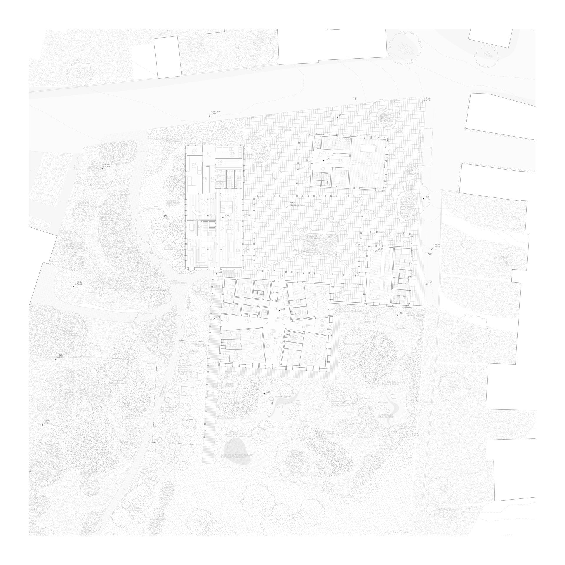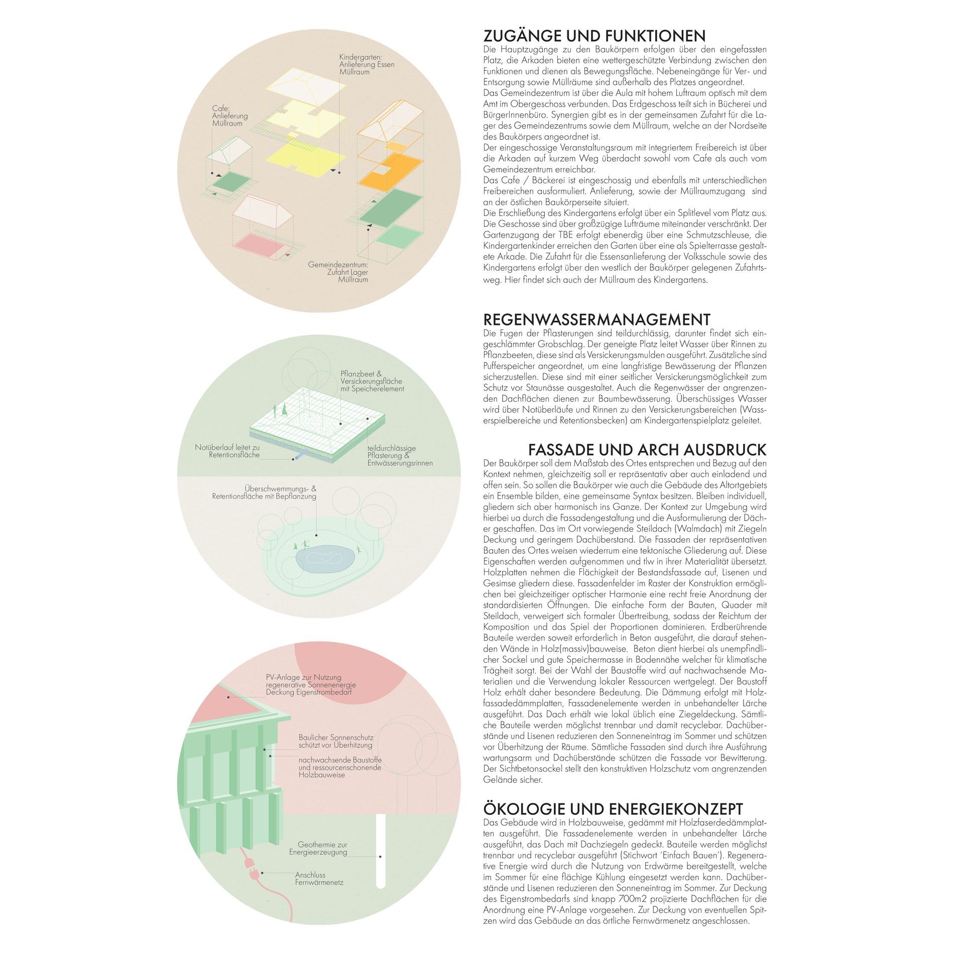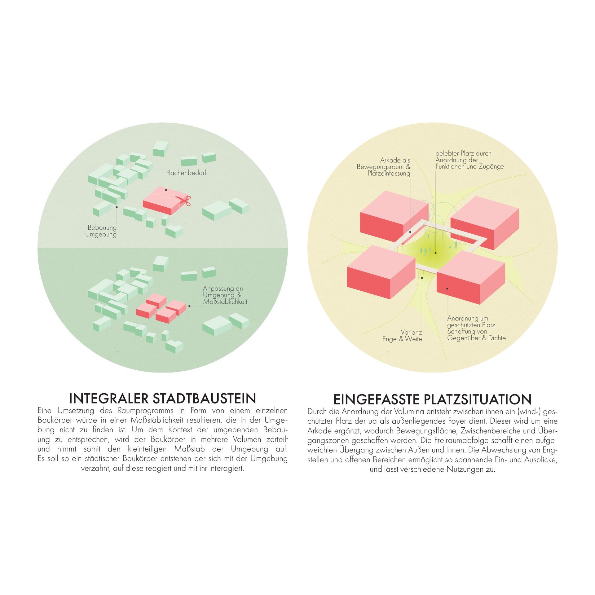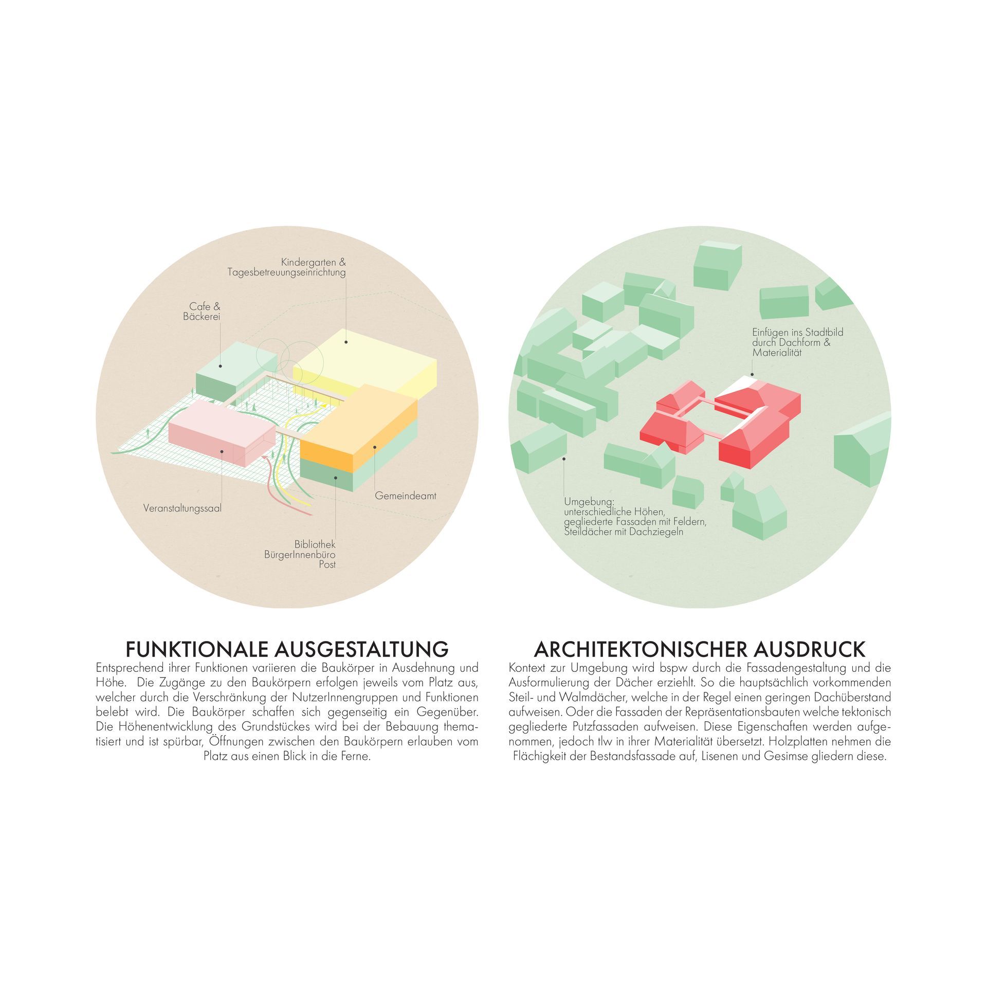 Pyhras alter Kern inklusive einige von Gebäuden gefasste Straßen, weisen eine starke Urbanität und städtische Dichte auf. So verfügt der Platz um die Kirche Hl. Margarete mit dem angrenzenden Höhensprung, sowie der schrägen Fläche vor dem Gasthaus Huber, über spürbare Aufenthaltsqualität. Allerdings ist der Ort außerhalb des alten Kerns stark zersiedelt. Der Bauplatz für das Kinder- und Gemeindezentrum Pyhra liegt an der Bruchkante zwischen dichtem Stadtraum und Einfamilienhausteppich. Es stellt sich also die Frage, ob es eine Interaktion mit den anderen (Stadt-) Baukörpern geben soll und wenn ja, inwiefern? Gemeindezentren haben eine soziale Bedeutung, sind gemeinschaftsstiftenden Identifikationsorte und setzen im besten Fall einen städtebaulichen Schwerpunkt. Der zentrale Ansatz lässt sich als die Errichtung eines funktionierenden und lebendigen Stadtbausteines beschreiben - für uns benötigt Pyhra keinen ausgefallenen Akzent um das Ortsbild weiter zu differenzieren und auch keine zu kleinteilige Zergliederung ohne Dichte, Pyhra braucht einen städtischen Körper, welcher sich schlüssig mit der umliegenden Bebauung verzahnt ein Zeichen dessen, dass die Stadt allen gehört und den Anwohnern dient. Der Baukörper soll also dem Maßstab des Ortes entsprechen und Bezug auf den Kontext (Altort und Geländeentwicklung) nehmen, gleichzeitig soll er repräsentativ aber auch einladend und offen sein.