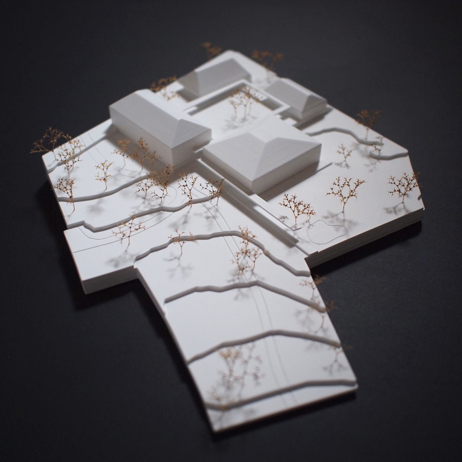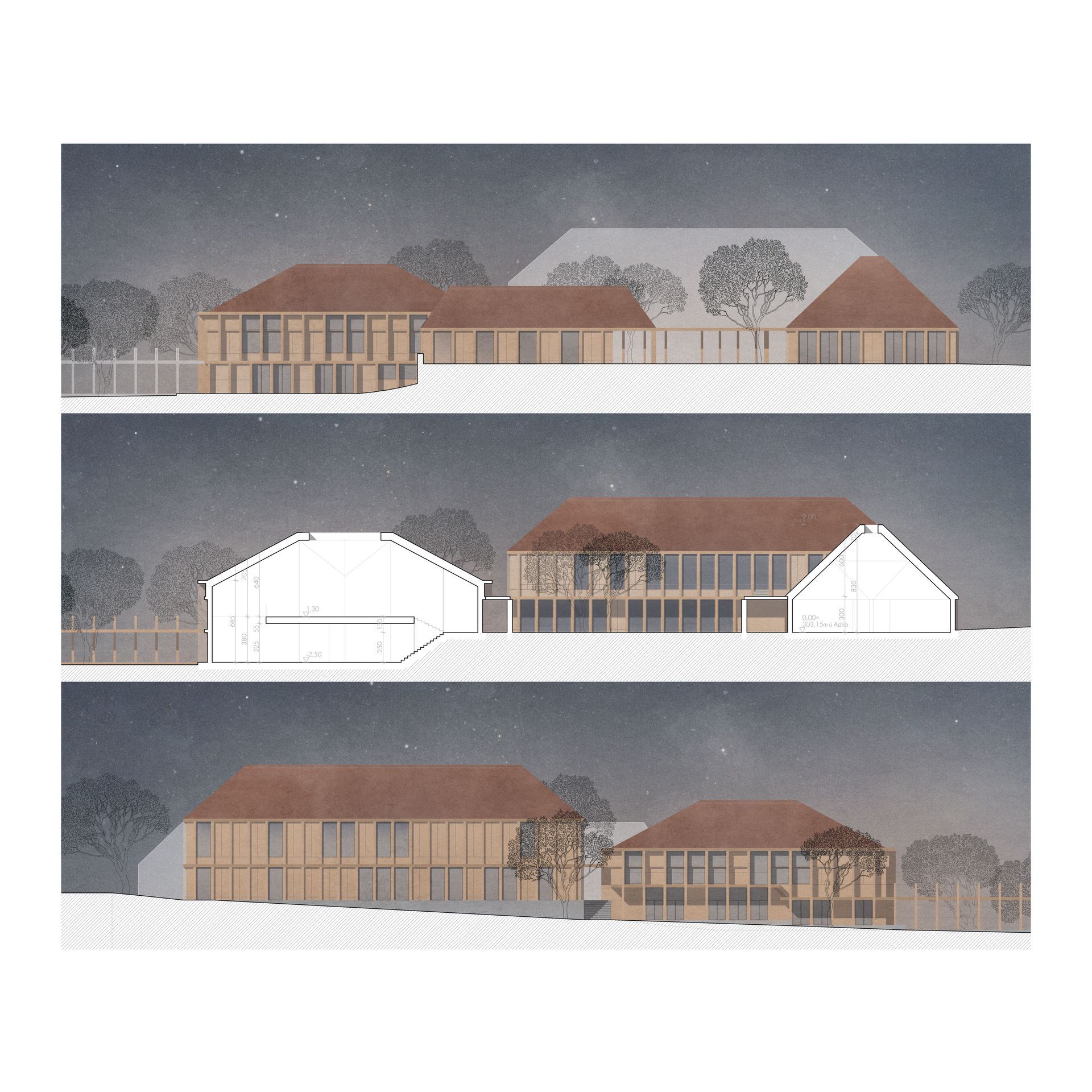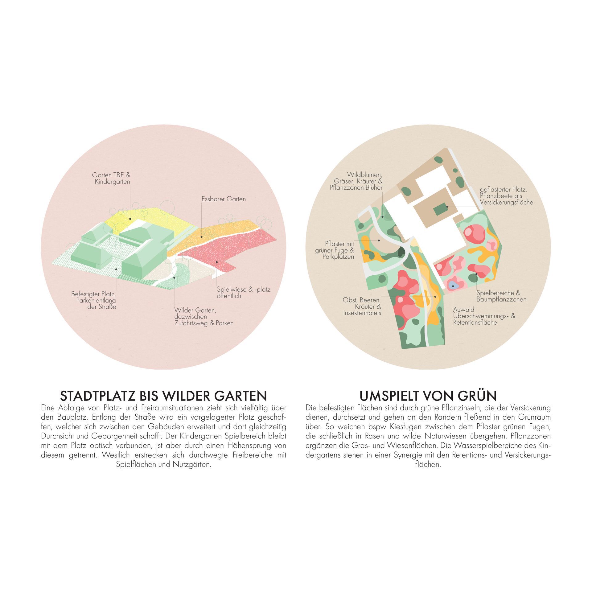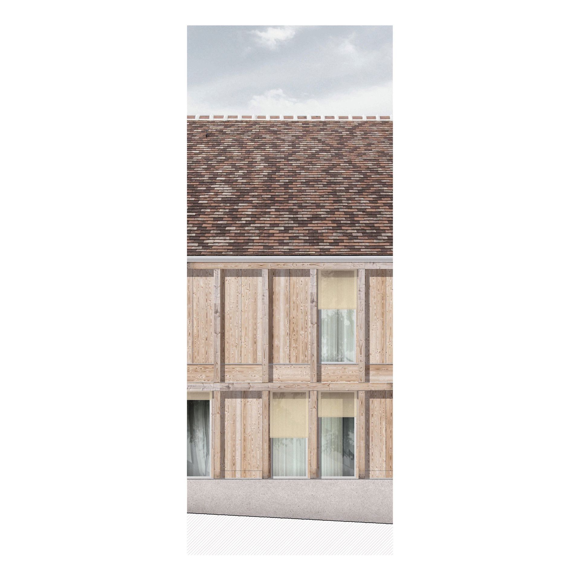 Pyhras alter Kern inklusive einige von Gebäuden gefasste Straßen, weisen eine starke Urbanität und städtische Dichte auf. So verfügt der Platz um die Kirche Hl. Margarete mit dem angrenzenden Höhensprung, sowie der schrägen Fläche vor dem Gasthaus Huber, über spürbare Aufenthaltsqualität. Allerdings ist der Ort außerhalb des alten Kerns stark zersiedelt. Der Bauplatz für das Kinder- und Gemeindezentrum Pyhra liegt an der Bruchkante zwischen dichtem Stadtraum und Einfamilienhausteppich. Es stellt sich also die Frage, ob es eine Interaktion mit den anderen (Stadt-) Baukörpern geben soll und wenn ja, inwiefern? Gemeindezentren haben eine soziale Bedeutung, sind gemeinschaftsstiftenden Identifikationsorte und setzen im besten Fall einen städtebaulichen Schwerpunkt. Der zentrale Ansatz lässt sich als die Errichtung eines funktionierenden und lebendigen Stadtbausteines beschreiben - für uns benötigt Pyhra keinen ausgefallenen Akzent um das Ortsbild weiter zu differenzieren und auch keine zu kleinteilige Zergliederung ohne Dichte, Pyhra braucht einen städtischen Körper, welcher sich schlüssig mit der umliegenden Bebauung verzahnt ein Zeichen dessen, dass die Stadt allen gehört und den Anwohnern dient. Der Baukörper soll also dem Maßstab des Ortes entsprechen und Bezug auf den Kontext (Altort und Geländeentwicklung) nehmen, gleichzeitig soll er repräsentativ aber auch einladend und offen sein.